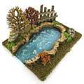Accessori per presepe: laghetto alberato illuminato, parte finale di fiume modulare per presepe. Dimensioni: 21 x 25 x 17 cm. Materiali: legno, sughero e muschio. Altre caratteristiche: LED bianco ghiaccio che illumina il laghetto, con alimentazione a batteria. Realizzato artigianalmente in Italia.