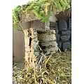 Capanna vuota con muro a sassi e porta in resina, ideale per statuine da 6/7 cm. Dimensioni: 24 x 13 x 15 cm. Materiali: Muschio, Sughero, Paglia e Legno. Realizzato artigianalmente in Italia.