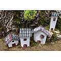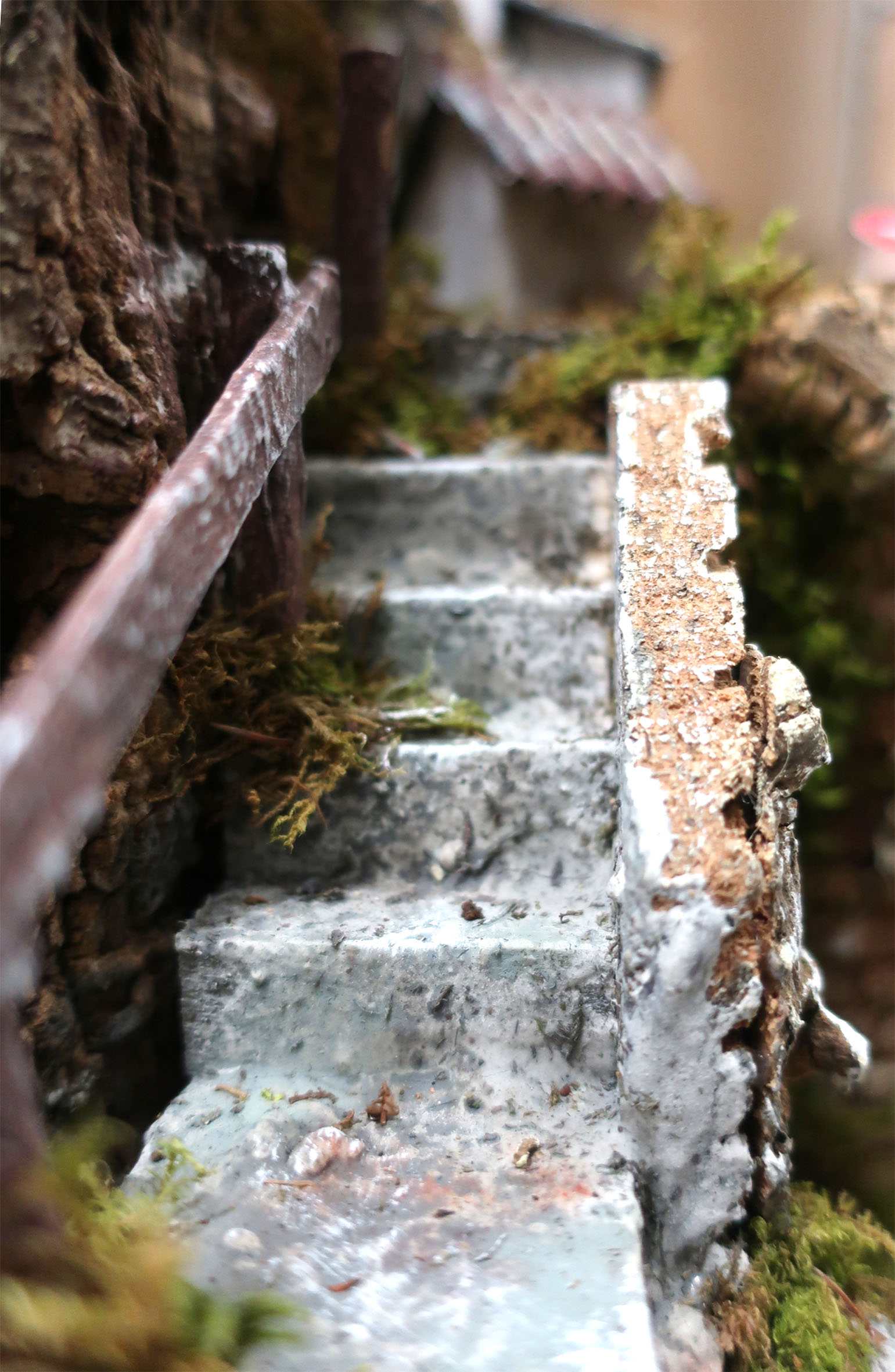 Paesaggio con casette e elementi decorativi elettrici. Questo grande paesaggio per presepe ospita una grotta dove ci si aspetta trovi posto la Sacra Famiglia, e un secondo livello dove si trovano casette e dettagli di elementi naturali. La scena è riccamente adornata da dettagli molto curati, come attrezzi da lavoro tipici di ambientazioni agresti di presepi, scalinate, muretti con trame che riproducono mattoni e tettoie con tegole molto fedeli alla realtà. L'occhio, catturato da tali dettagli suggestivi, rimane piacevolmente colpito. La ricostruzione di elementi architettonici che ben si adattano alla conformazione degli elementi naturali rendono questo paese per presepe molto bello e affascinante. A completare la bellissima ambientazione, una fontana con acqua che scorre e un angolo con una lampadina LED che ricrea il suggestivo effetto del fuoco. Alimentazione elettrica 220 V. Ideale per statuine da 10 cm. Dimensioni: 58 x 38 x 40 cm. Materiali: legno, sughero, muschio, stucco e cartone. Realizzato artigianalmente in Italia.