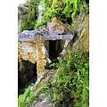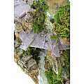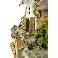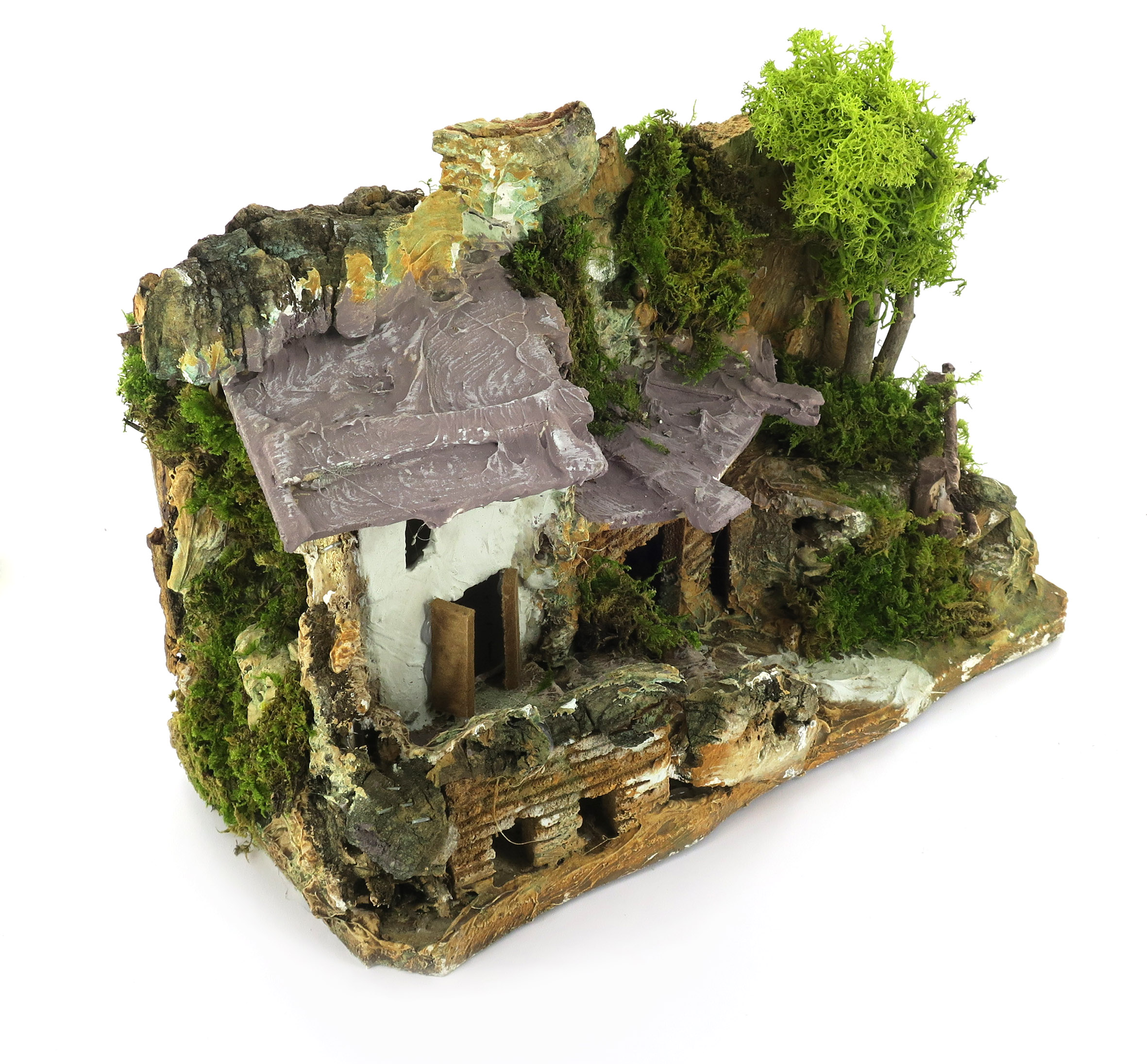 Accessori per presepe: Casa In Stucco Con Rimessa di Legna. Dimensioni: 13 x 25 x 19 cm. Materiali: legno, muschio, sughero, stucco e lichene. Realizzato artigianalmente in Italia.