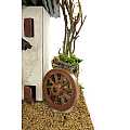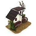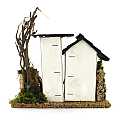 Accessori per presepe: Casetta con tettoie rosse. Dimensioni: 15 x 10 x 14 cm. Materiali: legno, sughero, muschio e cartone (Tranne il tetto realizzato in plastica). Realizzato artigianalmente in Italia.