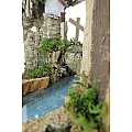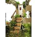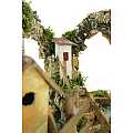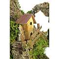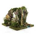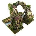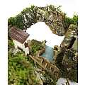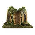Accessori per presepe: Gruppo di case su roccia, con tratto di fiume componibile. Materiali: legno, sughero, muschio e stucco. Dimensioni: 22 x 25 x 20 cm. Realizzato artigianalmente in Italia.