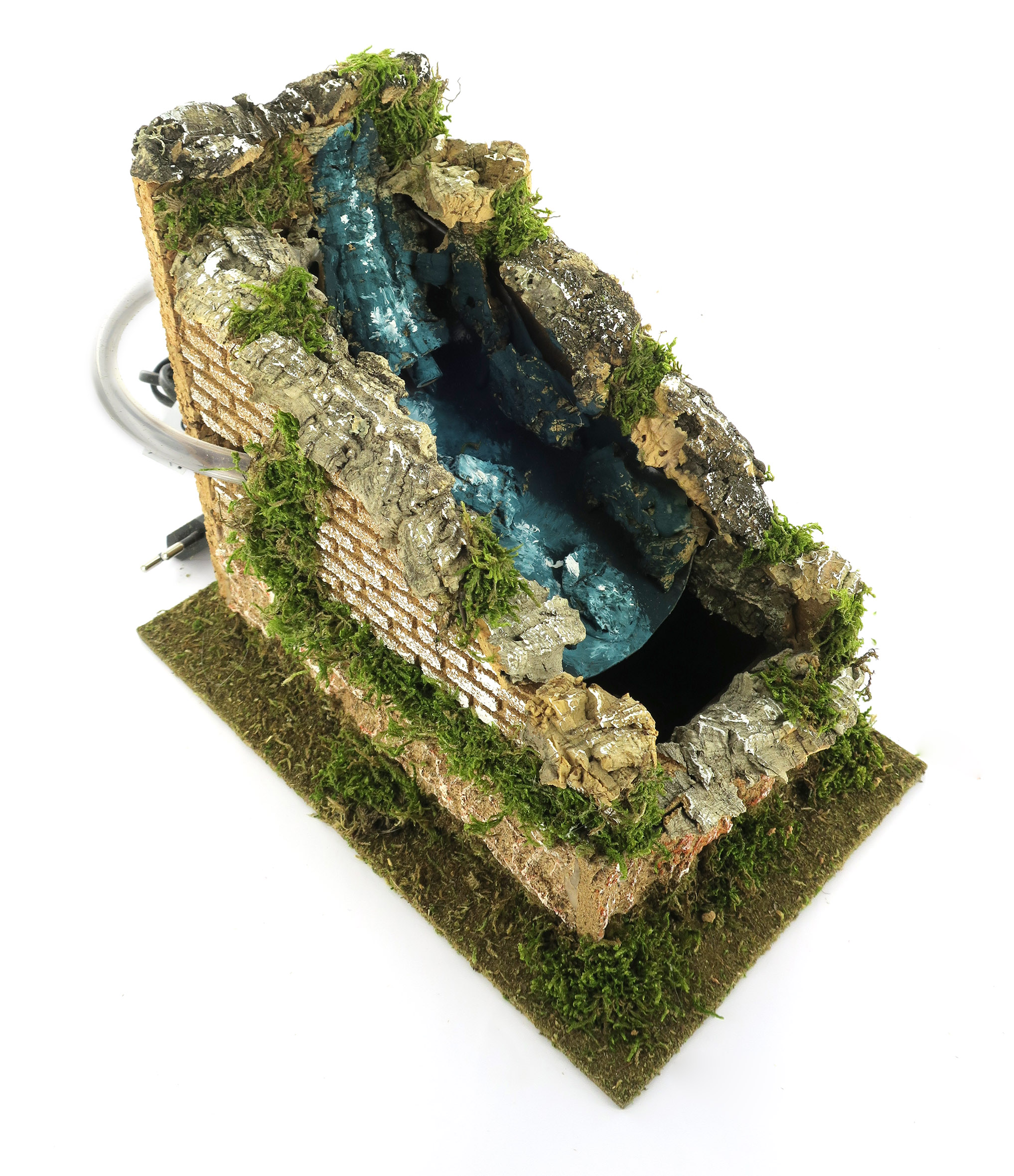 Accessori per presepe: Cascata. Alimentazione elettrica 220 V. Materiali: legno, sughero, muschio e stucco. Dimensioni: 24 x 16 x 20 cm. Realizzato artigianalmente in Italia.