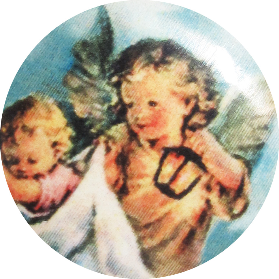La medaglietta è in porcellana con stampata una immagine rappresentante l'Angelo Custode con un bambino.Il bordo in argento 925 incornicia il tutto.Il diametro è di cm 1,8. Il peso è di 1,5 gr.Realizzato in Italia.