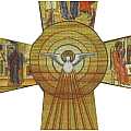 La croce raffigura la discesa dello Spirito Santo su Maria, gli apostoli radunati nel Cenacolo, l'annunciazione, la trinità e la deposizione di Gesù. Al centro la Colomba discende su Maria.La stampa è su legno MDF ed il peso è di gr. 17Realizzato in Italia.