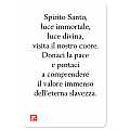 Immagine plastificata con raffigurata da un lato Pentecoste e dall'altra parte la seguente Preghiera: "Spirito Santo, luce immortale, luce divina, visita il nostro cuore. Donaci la pace e portaci a comprendere il valore immenso dell'eterna salvezza"Ideale come bomboniera per il Sacramento della Cresima.Dimensioni: 8,5 x 5,4 cm.Realizzato in Italia.