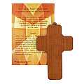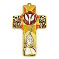 Certificato ricordo della Santa Cresima in cartoncino sottile (da compilare) confezionato in una busta trasparente con una croce in mdf.Sulla croce sono raffigurati i simboli della cresima e l'immagine è una stampa con rifiniture in oro a caldo.La croce misura 8,3x12,8 centimetri; la misura dell'altezza è comprensiva del foro per poterla appendere.Prodotto in Italia