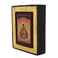 Piccola icona da parete, dalla forma quasi quadrata, che raffigura la Vergine dell'Alleanza, soggetto esposto nella chiesa di S. Carlo Borromeo a Londra. In tale rappresentazione, la Vergine Maria rappresenta la Chiesa e poggia le proprie mani sulle spalle dello sposo e della sposa. Al centro della scena, i due sposi tendono la propria mano l'uno verso l'altro, come manifestazione della loro volontà a intraprendere il percorso del matrimonio insieme. Tra i due sposi trova posto il Signore, che tiene loro le mani. Sopra alla scena, un drappo rosso che simboleggia la Shekinah, gloria di Dio e sua presenza. Si tratta di una copia d'arte bizantina. L'immagine è una fine litografia incollata su legno e rifinita con foglia d'oro, mentre le aureole, le scritte e i bordi sono realizzati a mano. Grazie al bordo interno incassato di colore bordeaux, che dona ulteriore risalto ai soggetti, quello esterno spicca, fungendo da cornice alla rappresentazione. Il gancio sul retro consente di appendere l'icona al muro. Considerando il soggetto, è particolarmente indicata come regalo per sposi, anniversari di matrimonio e conferme delle promesse. Dimensioni (cm): 7 (L) x 8 (A) x 2 (P). L'icona degli sposi è disponibile anche in altre dimensioni (codici 052301, 052302, 052303).