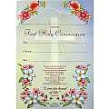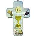 Croce in legno MDF con l'immagine dei simboli della prima comunione: il calice, l'uva e le spighe. Confezionata singolarmente con cartoncino da compilare con i dati relativi alla cerimonia, una sorta di "Certificato ricordo" a testimonianza di questo grande giorno nella vita di un piccolo fedele che sta crescendo. Ideale sia come bomboniera, sia come ricordo del sacramento della comunione.Prodotto in lingua inglese, dedicato ai fedeli inglesi, americani e dei paesi di lingua inglese.