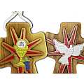 Croce realizzata in legno di ulivo con calice in rilievo e sul retro,sempre in rilievo,la colomba simbolo dello Spirito Santo. Viene fornita con cordoncino bianco. Ideale come bomboniera per chi celebra la Prima comunione e la Santa cresima contemporaneamente.ma sia per maschi che femmine. Prodotta da un azienda italiana esperta nella lavorazione del legno di ulivo.