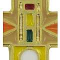 Pendente Croce di misura 3,5 x 2,5 con cordoncino imitazione cauciù nero. La croce è in metallo dorato ed ha motivi geometrici smaltati in colore arancio di varie tonalità.Tutto made in Italy