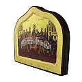 Icona da parete, di forma particolare con parte superiore ad arco inflesso, che raffigura l'Ultima Cena. Si tratta di una copia d'arte bizantina. L'immagine è una fine litografia incollata su legno e rifinita con foglia d'oro, mentre le aureole, le scritte e i bordi sono realizzati a mano. Il bordo della tavola lignea è in rilievo e funge da cornice alla rappresentazione. Lo sfondo, di color oro lucido, dona ulteriore risalto ai soggetti. Il gancio sul retro consente di appendere l'icona al muro. L'Ultima Cena è strettamente collegata al concetto di Eucarestia, ed è stata raccontata da tutti e 4 gli evangelisti nei seguenti passi del Nuovo Testamento: Matteo 26,20-30 / Marco 14,17-26 / Luca 22,14-39 / Giovanni 13,1-20. Per tale ragione, questa icona è particolarmente consigliata come regalo per Comunioni.Il certificato sul retro attesta le caratteristiche di questa icona, realizzata in Grecia. Dimensioni (cm): 24 (L) x 18 (A) x 2,3 (P).