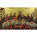Icona da parete, di forma particolare con parte superiore ad arco inflesso, che raffigura l'Ultima Cena. Si tratta di una copia d'arte bizantina. L'immagine è una fine litografia incollata su legno e rifinita con foglia d'oro, mentre le aureole, le scritte e i bordi sono realizzati a mano. Il bordo della tavola lignea è in rilievo e funge da cornice alla rappresentazione. Lo sfondo, di color oro lucido, dona ulteriore risalto ai soggetti. Il gancio sul retro consente di appendere l'icona al muro. L'Ultima Cena è strettamente collegata al concetto di Eucarestia, ed è stata raccontata da tutti e 4 gli evangelisti nei seguenti passi del Nuovo Testamento: Matteo 26,20-30 / Marco 14,17-26 / Luca 22,14-39 / Giovanni 13,1-20. Per tale ragione, questa icona è particolarmente consigliata come regalo per Comunioni.Il certificato sul retro attesta le caratteristiche di questa icona, realizzata in Grecia. Dimensioni (cm): 31 (L) x 25,5 (A) x 2 (P).