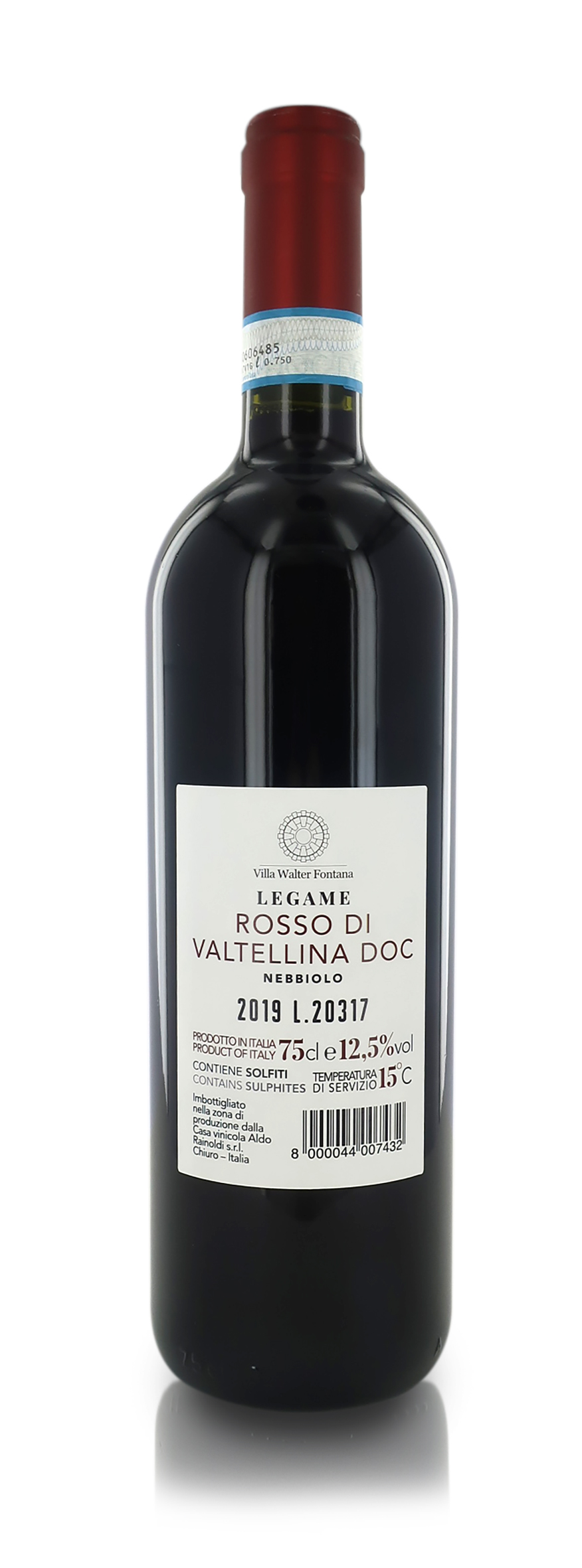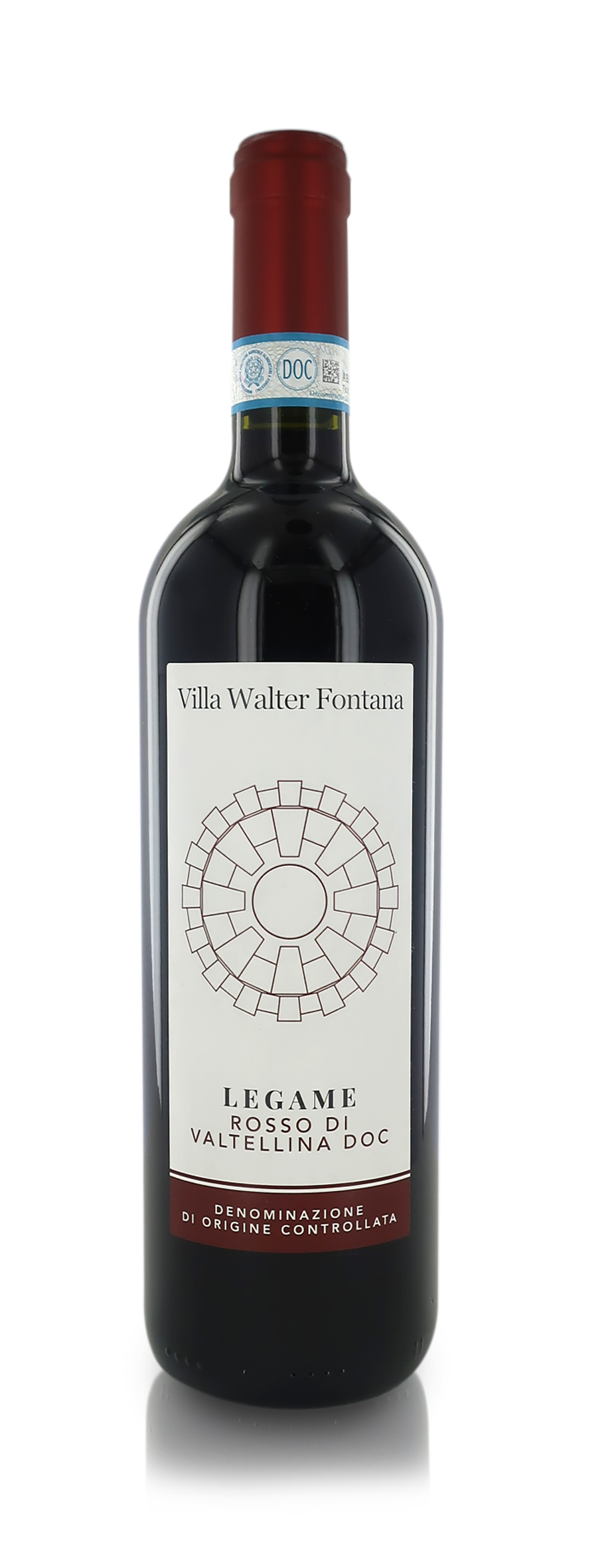 Vino rosso valtellinese "Legame" del marchio "Villa Walter Fontana". Cartone di 6 bottiglie da 750 ml l'una. Si tratta di un Rosso di Valtellina DOC realizzato con varietà d'uva "Nebbiolo" (Chiavennasca). Rientra nel gruppo dei vini rossi fermi. Vanta una gradazione alcolica di 13,5% e un colore rosso rubino. All'olfatto, si percepisce un bouquet fruttato e fresco dai sentori di sottobosco e frutta a polpa rossa. Al palato, il sapore risulta armonico e fragrante. I vitigni sorgono a una quota di 400-600 m.s.l.m. e garantiscono una resa media di 8500 kg di uva per ettaro. La vinificazione di questo Rosso di Valtellina DOC prevede una maturazione di 5 mesi in botti di rovere da 25 e 56 hl e un affinamento in bottiglia. Come gustarlo: a 15 °C in bicchiere "Ballon". Ideale con antipasti, salumi, primi piatti elaborati e carni magre. Contiene solfiti. La collezione di vini pregiati e superalcolici Villa Walter Fontana, considerata tra le più rilevanti in Italia, si caratterizza per sostenibilità, pazienza e tradizione, principi chiave di una viticoltura "eroica" che punta a promuovere un territorio che non ha pari nel suo genere, salvaguardandone le peculiarità e facilitandone l'incontro con il consumatore. Nei territori montani della Valtellina, con le viti che si inerpicano verso il cielo, la produzione di Villa Walter Fontana è unica, ottenibile soltanto con grande passione, pazienti attività manuali e un carico di lavoro quattro volte superiore a quello della classica coltivazione della vite in collina.