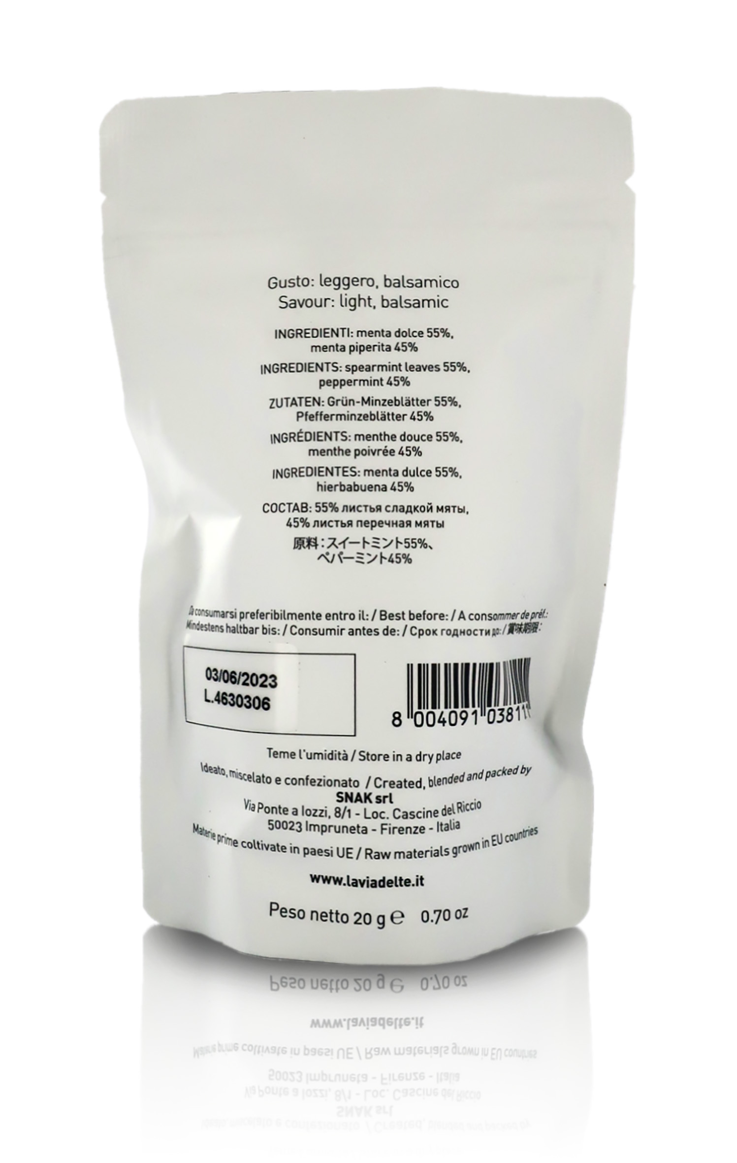 Miscela sfusa per la preparazione di tisana alla menta, realizzata con menta piperita e menta dolce. La menta piperita è conosciuta fino dall'antichità per le sue proprietà aromatiche, antispasmodiche, digestive e antisettiche. Le sue foglie sono impiegate per aggiungere aroma a tè, infusi e preparazioni gastronomiche. La tisana alla menta vanta un colore giallo chiaro, un aroma penetrante e un sapore dolciastro. In pratico sacchetto da 20g facilmente richiudibile. Preparazione: 3-4 grammi per una tazza (150 cc di acqua bollente) in infusione per 5-6 minuti almeno. Ingredienti: Menta piperita e menta dolce. Abbinamenti: Biscottini da tè con pasta di mandorla. Teme l'umidità. Conservare in luogo fresco e asciutto. L’attività de La Via del Tè, marchio ideato negli anni '80, affonda le sue radici nel 1961. Oggi come allora, l’importazione dei migliori raccolti dai paesi d’origine, la passione per la scoperta di nuove miscele e l'artigianalità fiorentina sono i punti di forza di questa marca di tè di eccellenza italiana.