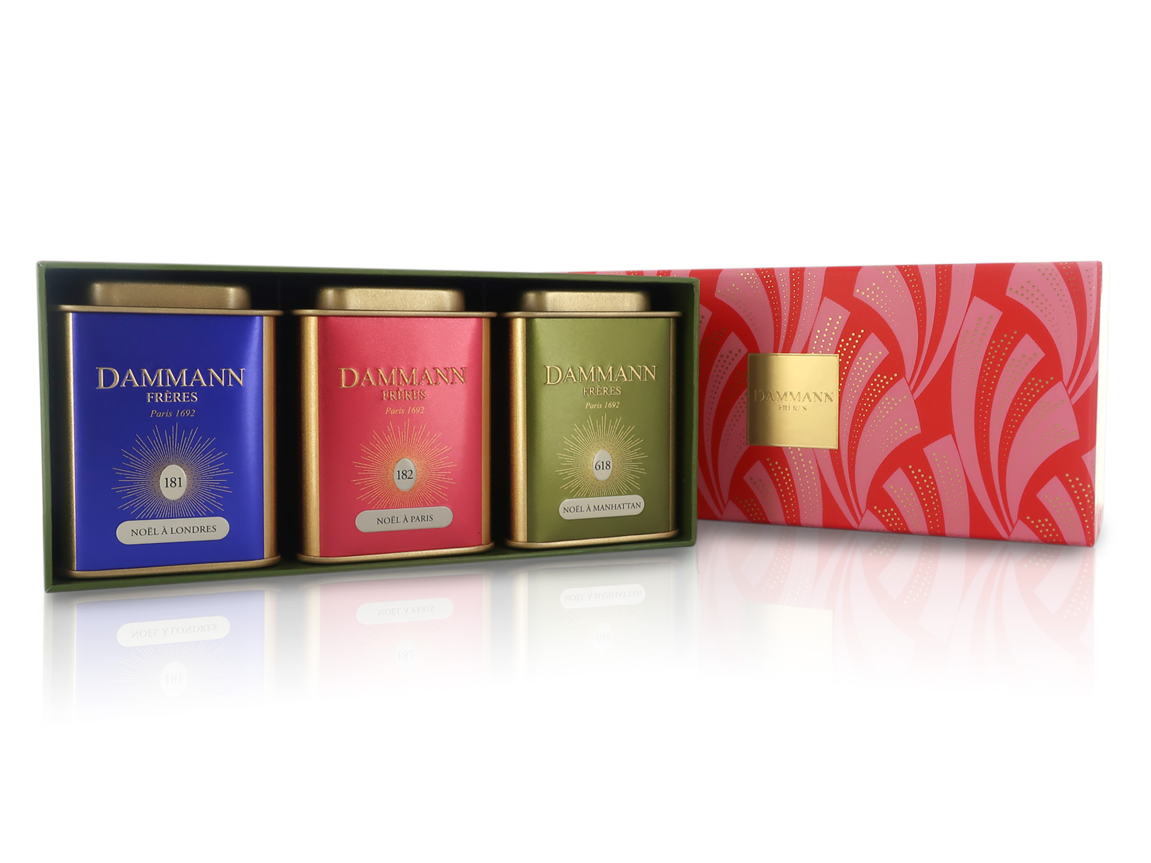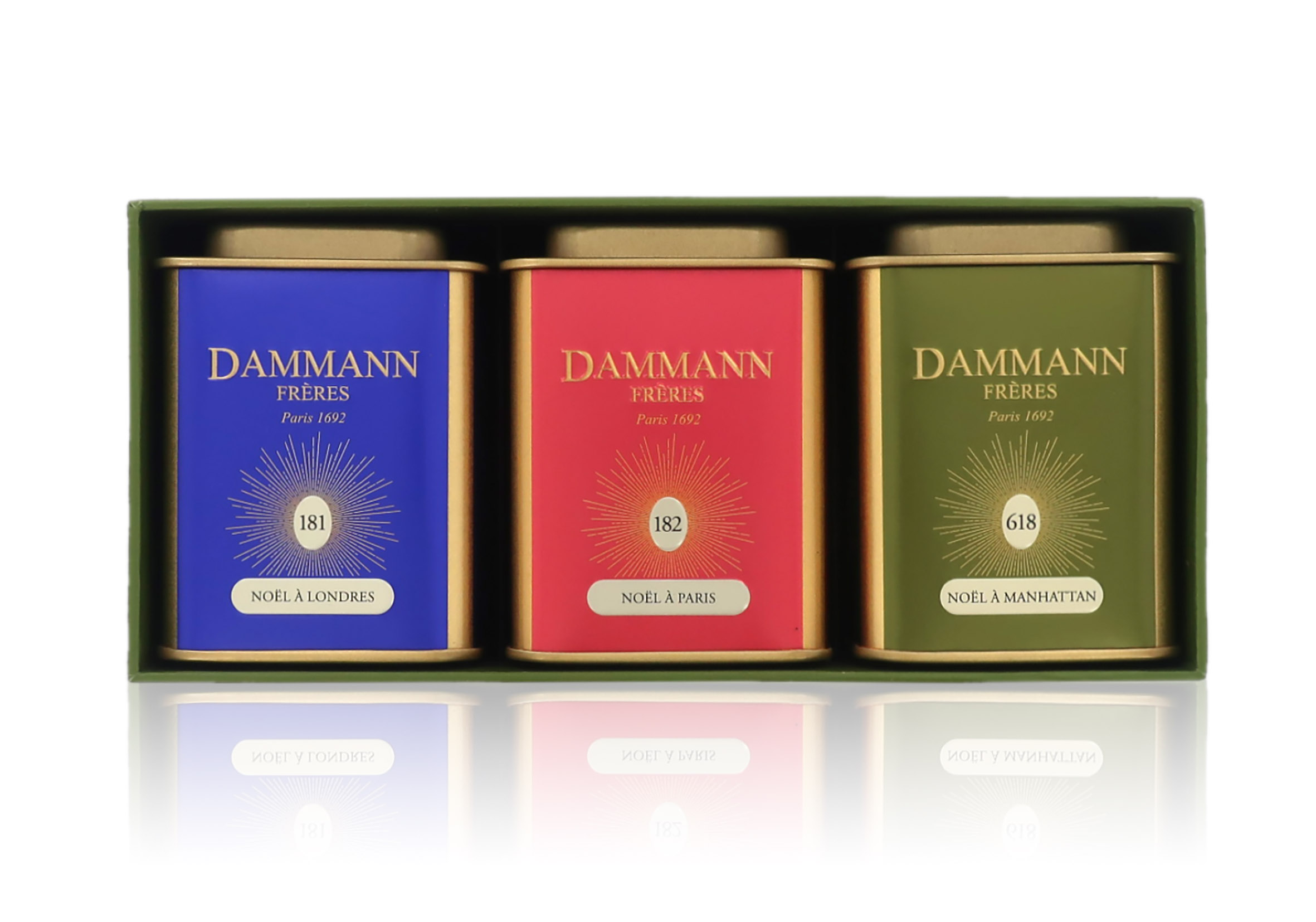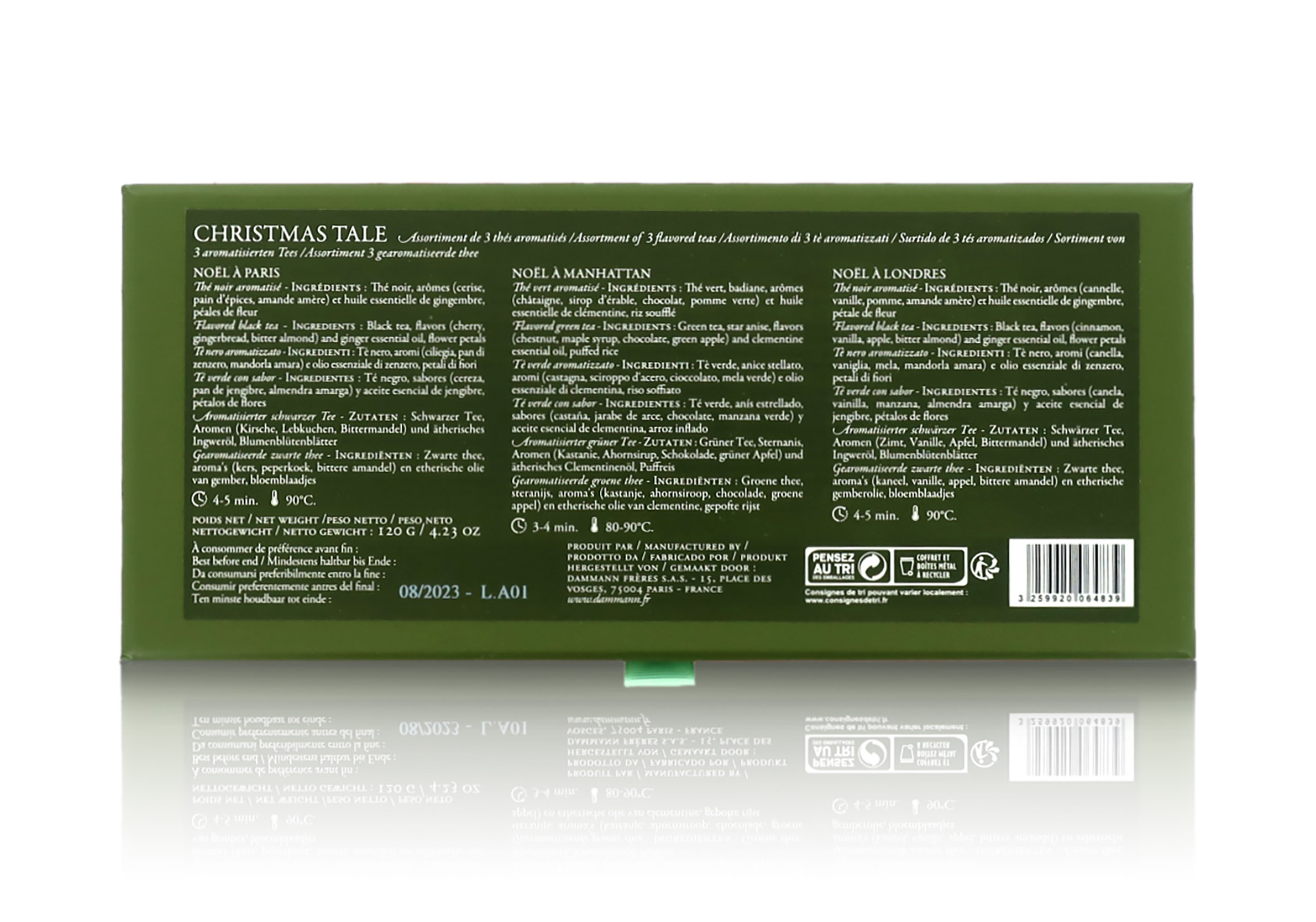Cofanetto regalo "Christmas Tale" (Racconto di Natale) con un assortimento di 3 pregiate miscele per infusioni natalizie (2 tè neri e 1 tè verde) in formato sfuso. Le miscele incluse in questa idea regalo, perfetta per gli appassionati degli infusi d'autore, sono aromatizzate con gli inconfondibili profumi del Natale. La scatola regalo, dal design colorato ed elegante, include 3 mini-latte colorate molto graziose, ognuna contenente 40g di miscela aromatizzata. La confezione include: Noël à Londres (miscela di tè neri con aroma dominante di zenzero e secondari di cannella, vaniglia, mela e mandorla: un tè dai dolci profumi natalizi); Noël à Paris (miscela di tè neri, i sapori fruttati di ciliegia, mandorla e zenzero); Noël à Manhattan (tè verde fresco con una leggera astringenza, con note di castagna, sciroppo d'acero e cacao e un finale fruttato e fresco con profumo di clementina e anice stellato. Peso netto totale: 120g. Formato: sfuso. Istruzioni su tempi e temperature d'infusione specifici sono indicati chiaramente sulla scatola e sulle latte. La gloriosa storia di Dammann Frères comincia nel 1692 con l'autorizzazione di Luigi XIV a importare tè in Francia. Dopo più di tre secoli, Dammann Frères continua a essere riconosciuta come una istituzione, commercializzando più di 300 varianti di tè pregiato in formato sfuso, elegantissime confezioni di latta o raffinate bustine Cristal. Conservare in luogo fresco e asciutto, al riparo dalla luce e lontano da fonti di calore.
