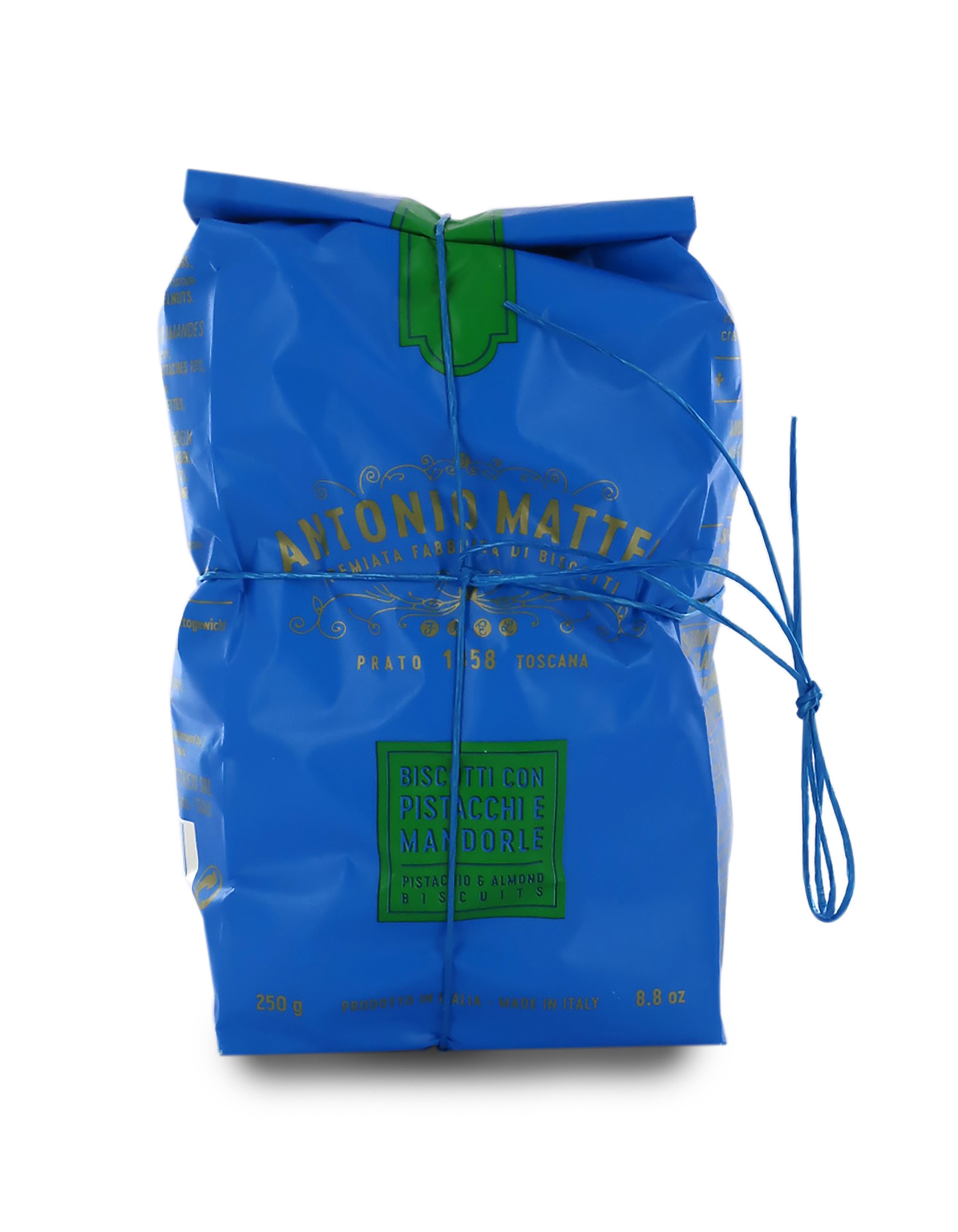L'offerta prevede 12 pacchetti da 250g l'uno.Pietra miliare della pasticceria classica toscana, i cantucci di Prato sono perfetti come dolce fine pasto, meglio se in abbinamento con il vinsanto. La tradizione li vuole realizzati con le mandorle. Nel 2017, Mattei realizza il cantuccio con pistacchi e mandorle, ancora più goloso! Per la sua preparazione, vengono selezionate pregiati pistacchi e mandorle che spiccano per la loro significativa grammatura e l'attento grado di tostatura. Si distinguono dalle preparazioni su larga scala perché vengono impacchettati a mano con cura e non contengono conservanti, grassi animali e vegetali. Abbinamenti consigliati: vini da dessert, grappe morbide o gin speziati. Per la merenda o la colazione con caffè o tè, ma anche con gelato alla vaniglia o cioccolato. Ingredienti: farina di GRANO tenero, zucchero, UOVA di galline allevate all' aperto, PISTACCHI 10%, MANDORLE 10%. Può contenere BURRO, SOIA, PINOLI e NOCCIOLE. Allergeni in maiuscolo. Conservare in luogo fresco e asciutto, al riparo da luce diretta e fonti di calore. La Premiata Fabbrica di Biscotti Mattei nasce a Prato nel 1858 sfornando il famoso biscotto tradizionale alle mandorle, simbolo della città toscana. La qualità dei biscotti Mattei viene subito riconosciuta nella penisola tanto quanto al di fuori dei suoi confini, anche attraverso una menzione d’onore all’Esposizione Universale di Parigi nel 1867. Il «Piccolo Museo Bottega», aperto nel cuore di Firenze, illustra la storia dei celeberrimi cantucci alla mandorla e rende omaggio a un'attività dolciaria che dura ormai da più di 160 anni. Mattei non solo è citato da Hermann Hesse, ma vanta tra i suoi affezionati clienti anche l’ex-presidente degli Stati Uniti Bill Clinton e Carlo Azeglio Ciampi.