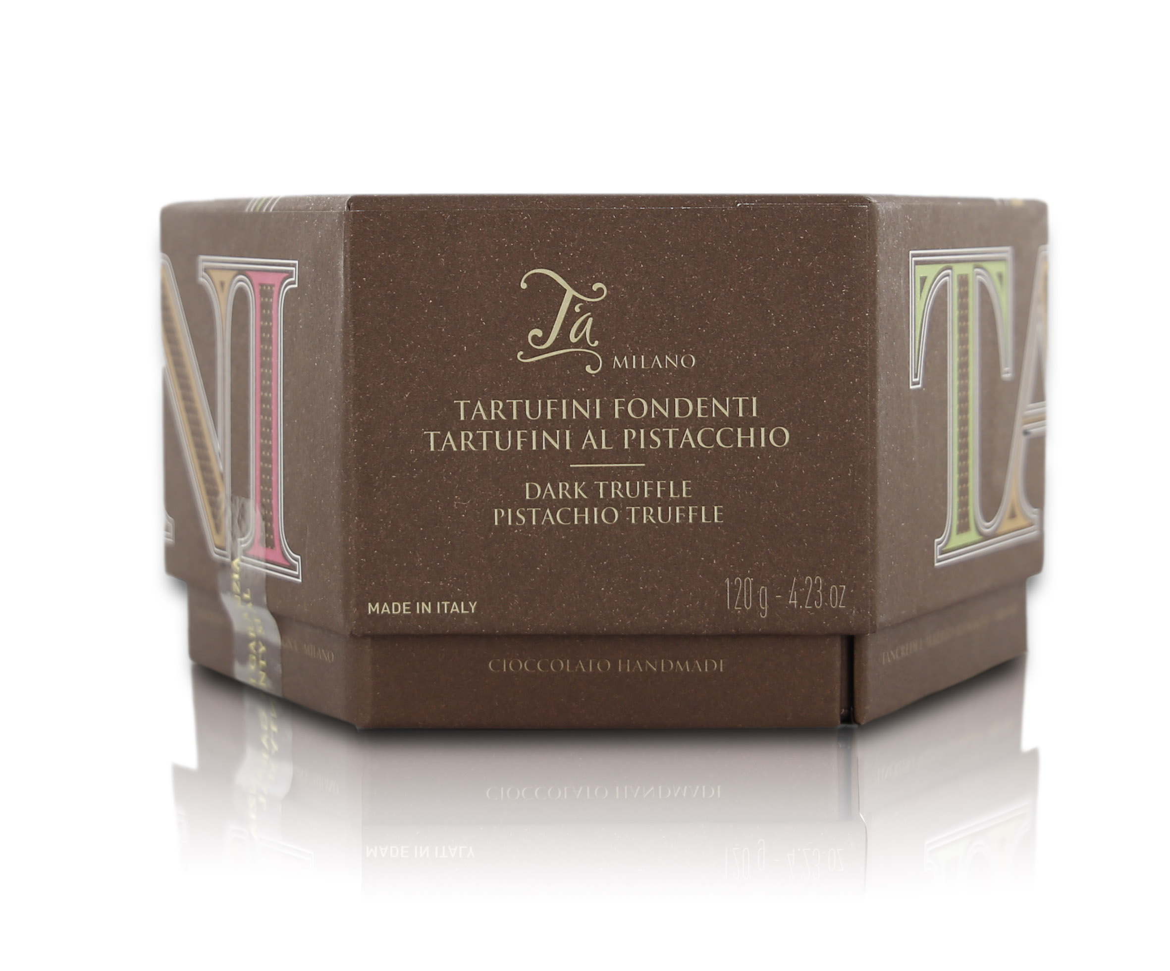 Una elegante confezione esagonale racchiude 14 tartufini in due gusti: 7 al cioccolato fondente e 7 al cioccolato fondente al pistacchio. Per mantenerne l'integrità e fare in modo che risaltino in tutta la loro bellezza, i tartufi sono riposti in appositi alloggiamenti sagomati e disposti su due livelli. La variante al cioccolato fondente ha un ripieno a base di nocciola e cioccolato fondente, mentre quella al pistacchio vanta un ripieno cremoso a base di nocciola e pistacchio. I tartufini sono realizzati con cioccolato fondente artigianale. L'esterno è ricoperto di cacao in polvere. Sono perfetti da offrire ai vostri ospiti insieme al caffè o come piccolo regalo per gli amanti dei dolci. "T'a Milano" è la firma della giovane ma tradizionale azienda di pasticceria e cioccolateria artigianale milanese che tutt'ora crea orgogliosamente le proprie delizie nei territori della provincia della Madunina. È un marchio che incorpora tanto la storia quanto la voglia d'innovazione, offrendo prodotti di altissimo livello che rientrano a pieno titolo in quel Made in Italy culinario che diventa eccellenza. Il motto di Tancredi e Alberto Alemagna, non a caso, è "italianità, qualità e design". Il loro è un cioccolato pluripremiato, che ha ottenuto diversi riconoscimenti di settore tra cui vari International Chocolate Award e premi Tavoletta d'Oro. Conservare in luogo fresco e asciutto.