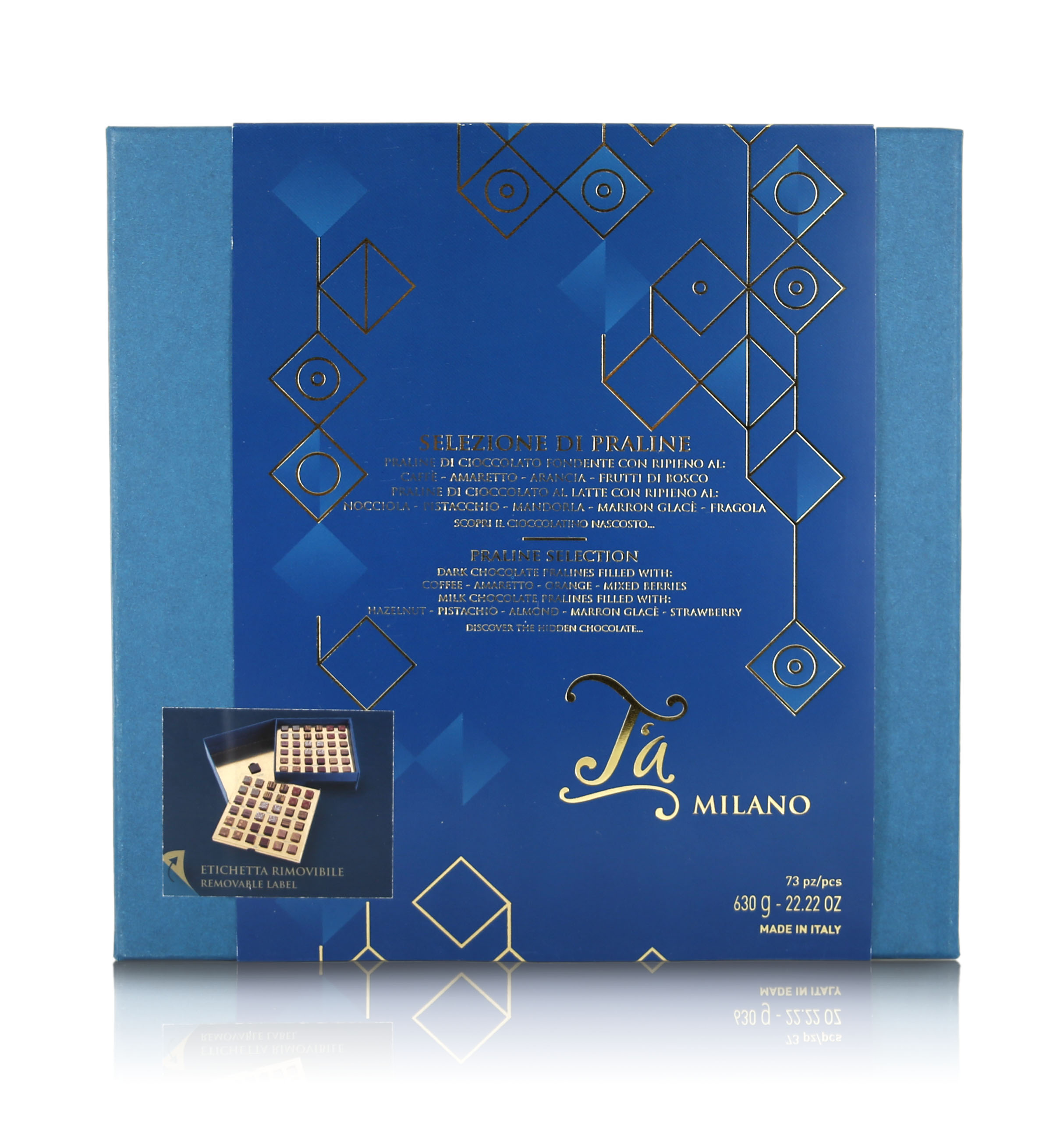 Una confezione colorata racchiude dolci tesori creati artigianalmente: 72 praline al cioccolato al latte e al fondente, con ripieni dai diversi gusti e con decori eseguiti a regola d'arte. Sono tanto belle da vedere quanto buone da gustare. Grazie ai loro gusti, queste praline di cioccolato offrono un viaggio tra le eccellenze italiane: nocciola, pistacchio, mandorla, fragola, marron glacé, caffè, arancia, frutti di bosco e amaretto. Sono una idea regalo perfetta, dall'effetto "wow" garantito. Gli scrigni nascondono un livello non visibile all'apertura, che chi apre il cofanetto viene invitato a scoprire "sbirciando" più in profondità. "T'a Milano" è la firma della giovane ma tradizionale azienda di pasticceria e cioccolateria artigianale milanese che tutt'ora crea orgogliosamente le proprie delizie nei territori della provincia della Madunina. È un marchio che incorpora tanto la storia quanto la voglia d'innovazione, offrendo prodotti di altissimo livello che rientrano a pieno titolo in quel Made in Italy culinario che diventa eccellenza. Il motto di Tancredi e Alberto Alemagna, non a caso, è "italianità, qualità e design". Il loro è un cioccolato pluripremiato, che ha ottenuto diversi riconoscimenti di settore tra cui vari International Chocolate Award e premi Tavoletta d'Oro. Senza OGM. La lista ingredienti e allergeni è sulla confezione del prodotto. Conservare in ambiente fresco e asciutto.