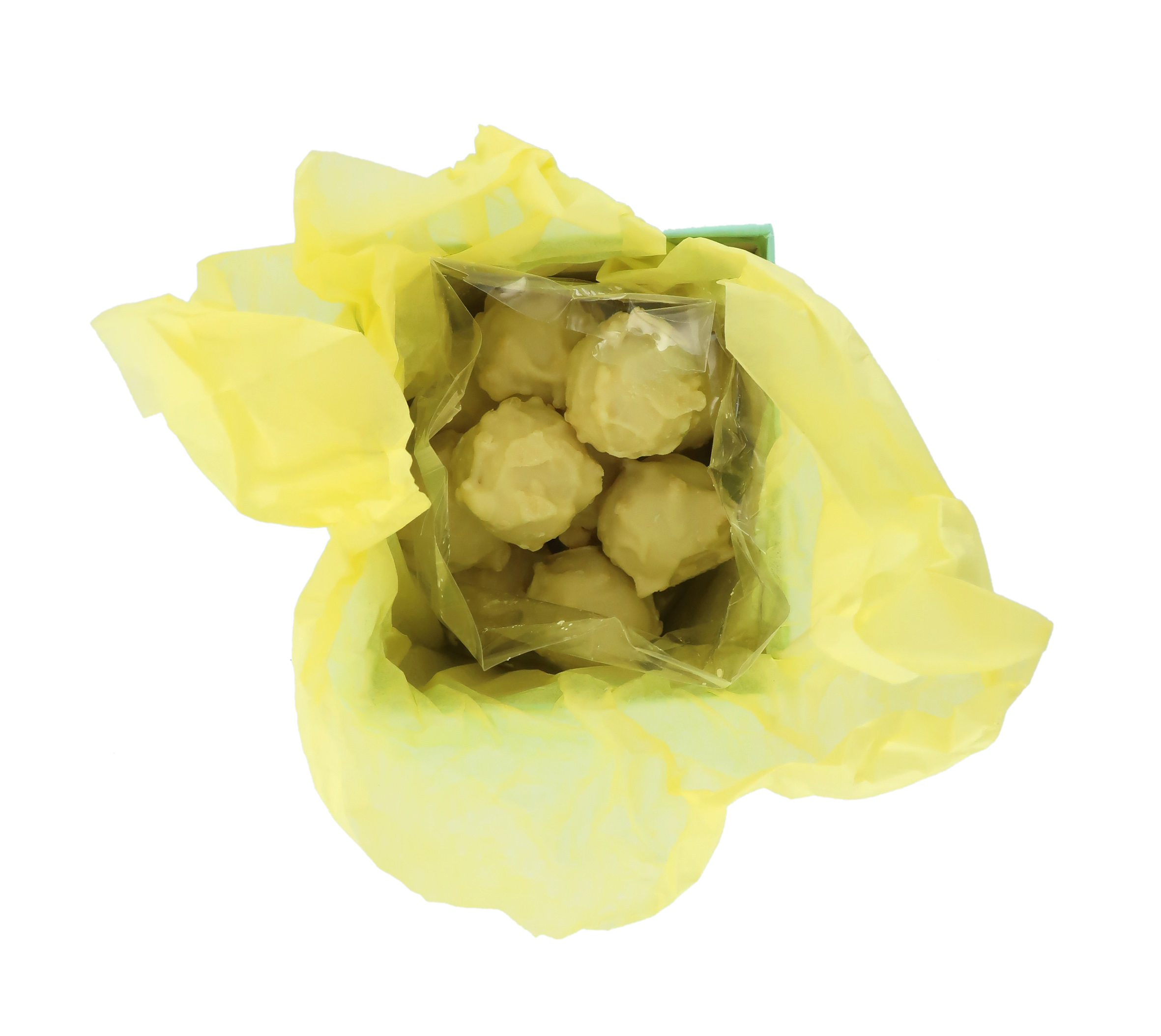 Iconici tartufi di cioccolato Prestat al London Gin, in sfarzoso cofanetto nei colori del giallo accesso e del verde chiaro, da 175g. Una morbida ganache alcolica aromatizzata al gin e limone è avvolta da uno strato di pregiatissimo cioccolato bianco Domori. Perfetta come idea regalo da sola o in un cesto natalizio con altre specialità dolci.Ingredienti: cioccolato bianco (zucchero, burro di cacao, LATTE intero in polvere, emulsionante: Lecitina di SOIA, aroma naturale di vaniglia), cioccolato al LATTE (zucchero, burro di cacao, LATTE in polvere, cacao, emulsionante: lecitina di SOIA), panna (LATTE), sciroppo di glucosio, gin 3%, burro (LATTE), preparazione a base di cristalli di zucchero [zucchero, glucosio, burro di cacao, anidride carbonica, lattosio (LATTE)], composto al limone (zucchero invertito, succo di limone concentrato, destrosio, saccarosio, acqua, aroma di limone, gelificante: gomma di xanthano, conservante: sorbato di potassio, regolatore di acidità: acido citrico), umidificante: sorbitolo, olio essenziale di bacche di ginepro, conservante: acido sorbico. Allergeni: latte, soia. Può contenere tracce di ALTRA FRUTTA A GUSCIO, UOVA e GLUTINE. Contiene alcol. Peso: 175g / 6.1oz. Conservare in luogo fresco e asciutto, lontano da luce diretta e fonti di calore, a una temperatura compresa tra i 15 e i 18 °C (dai 59 ai 65 °F). Prestat, fondata nel 1902, è una delle più antiche marche di cioccolato londinesi. Il suo ruolo di fornitore ufficiale di cioccolato della casa reale inglese le è valso ben due riconoscimenti (Royal Warrants) da parte della Regina Madre (1975) e della Regina Elisabetta II (1999). Tutti i prodotti Prestat sono realizzati con coperture di finissimo cioccolato Domori. Si racconta che lo stesso Roald Dahl, scrittore de "La fabbrica di cioccolato", sia stato ispirato proprio dai tartufi Prestat nella scrittura del romanzo.