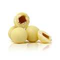 Una moderna confezione a forma di cubo, grazie ad alcuni lati trasparenti, lascia intravedere queste deliziose praline ricoperte di cioccolato bianco, che nascondono un cuore di purea di pesca. Il cioccolato bianco usato per rivestire queste pepite di frutta è artigianale, realizzato a mano. Grazie alla nota molto fresca della farcitura alla frutta, questi dragées con ripieno alla pesca possono essere consumati tutto l'anno, pure in estate, rendendo il cioccolato al latte invitante anche nelle giornate più calde. "T'a Milano" è la firma della giovane ma tradizionale azienda di pasticceria e cioccolateria artigianale milanese che tutt'ora crea orgogliosamente le proprie delizie nei territori della provincia della Madunina. È un marchio che incorpora tanto la storia quanto la voglia d'innovazione, offrendo prodotti di altissimo livello che rientrano a pieno titolo in quel Made in Italy culinario che diventa eccellenza. Il motto di Tancredi e Alberto Alemagna, non a caso, è "italianità, qualità e design". Il loro è un cioccolato pluripremiato, che ha ottenuto diversi riconoscimenti di settore tra cui vari International Chocolate Award e premi Tavoletta d'Oro. Conservare in luogo fresco e asciutto.