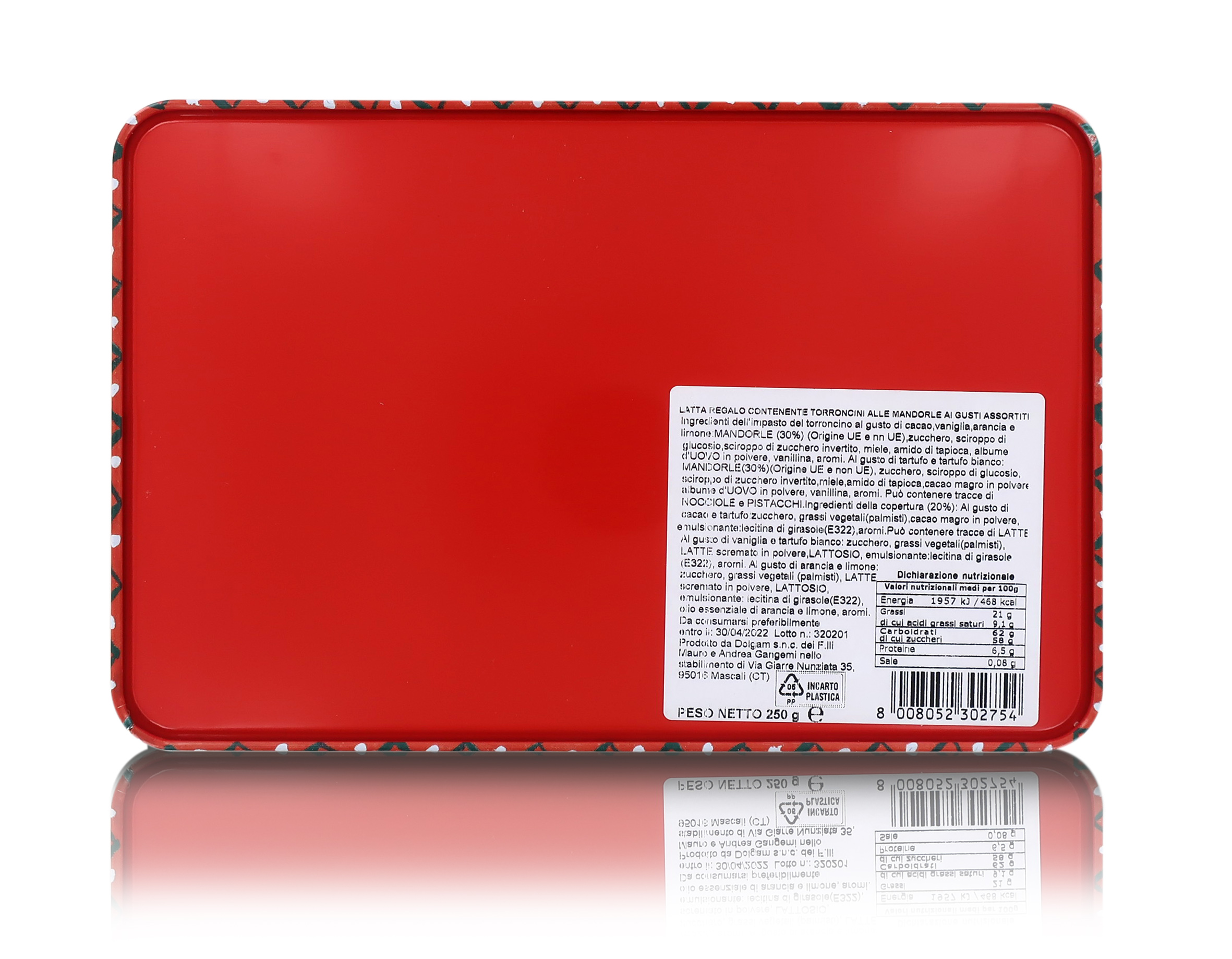 Una bellissima scatola regalo in latta a cofanetto, che somiglia a una borsa con manico, racchiude una selezione di torroncini morbidi alle mandorle della linea "I Siciliani", per un peso netto di 250g. I torroncini vantano una copertura in diversi gusti, tra cui vaniglia, cioccolato, tartufo nero, tartufo bianco, arancia e limone. I COLORI E IL MOTIVO/FANTASIA DELLA SCATOLA È VARIABILE E PUÒ DIFFERIRE DA QUELLE INDICATE NELLA FOTOGALLERIA DI PRODOTTO QUI PUBBLICATA. LA CREATIVITÀ DI DOLGAM SI TRADUCE ANCHE IN SCATOLE REGALO DALLE GRAFICHE DIVERSE, SEMPRE IN EVOLUZIONE. Ingredienti dell'impasto del torroncino al gusto di cacao, vaniglia, arancia e limone: MANDORLE (30%), zucchero, sciroppo di zucchero invertito, ARACHIDI, miele, amido di tapioca, sciroppo di glucosio, albume d'UOVO in polvere, vanillina, aromi. Al gusto di tartufo e tartufo bianco: MANDORLE(30%), zucchero, sciroppo di zucchero invertito, ARACHIDI, miele, amido di tapioca, sciroppo di glucosio, cacao magro in polvere, albume d'UOVO in polvere, vanillina, aromi. Può contenere tracce di NOCCIOLE e PISTACCHI. Ingredienti della copertura (20%): Se al gusto di cacao e tartufo: zucchero, grassi vegetali(palmisti) cacao magro in polvere, emulsionante: lecitina di SOIA (E322), aromi. Può contenere tracce di LATTE. Se al gusto di vaniglia e tartufo bianco: zucchero, grassi vegetali(palmisti), LATTE in polvere, LATTOSIO, emulsionante:lecitina di SOIA(E322), aromi. Se al gusto di arancia e limone: zucchero, grassì vegetali (palmisti), LATTE scremato in polvere, LATTOSIO, emulsionante: lecitina di SOIA(E322), olio essenziale di arancia e limone, aromi.