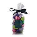 Sacchettino regalo trasparente con fiocchetto in tessuto, contenente 250g di ovetti di cioccolato al latte e fondente con morbido ripieno alla nocciola. Gli ovetti sono incartati in carta stagnola colorata, nelle nuance del rosa, viola e verde. Peso: 250g. Prodotto senza glutine. Conservare in luogo fresco e asciutto, al riparo dalla luce e da fonti di calore.