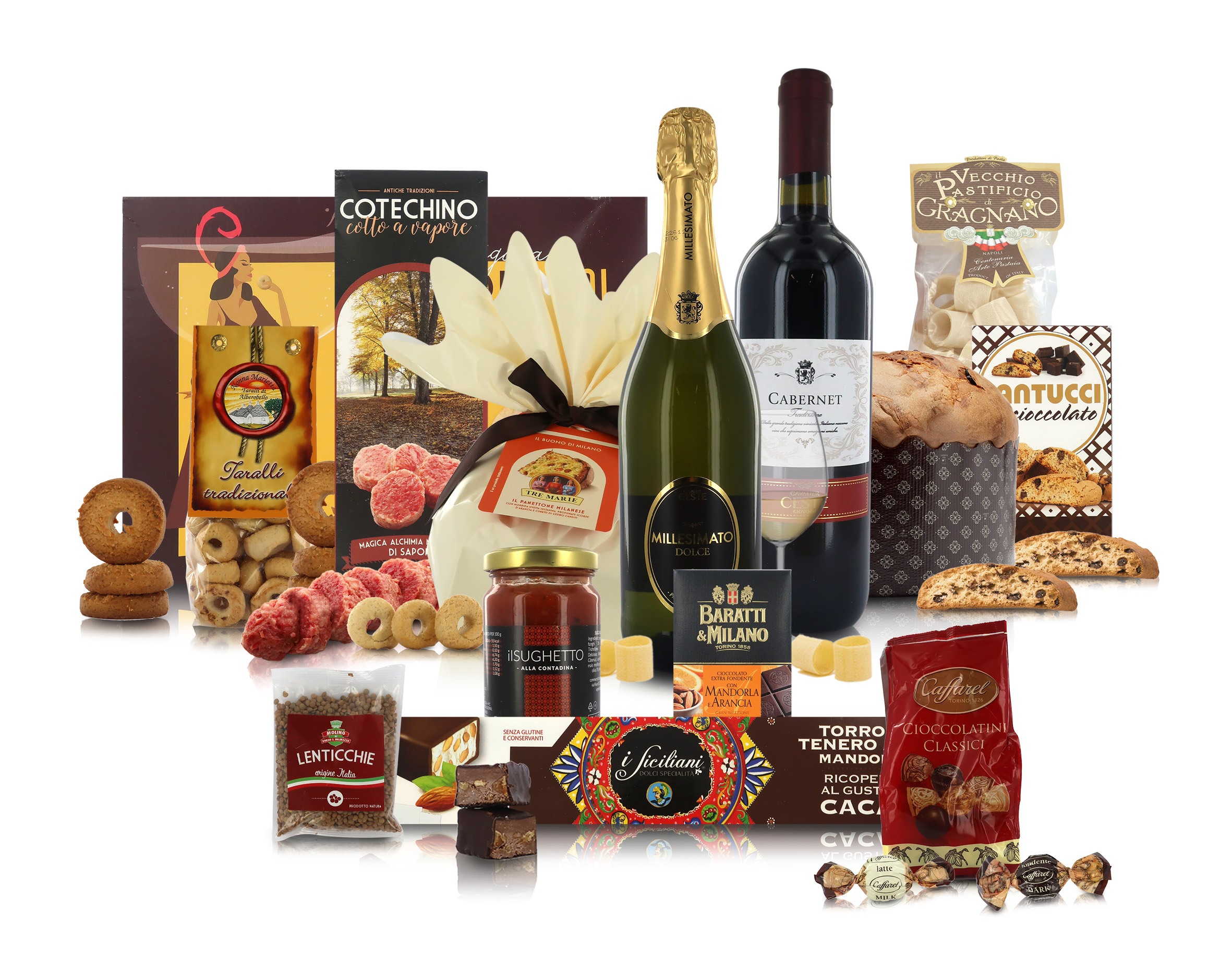 Intramontabile idea regalo natalizia, il cesto di prodotti tipici alimentari riscuote ogni anno un grande successo tra amici, parenti e dipendenti. Questo particolare cesto regalo di Natale è realizzato in Italia da Villa Guelfa e include le seguenti specialità: • Panettone Classico Milanese, incartato a mano Tre Marie, g 750 • Bottiglia Spumante Brut Millesimato 2022 Cantine Cav. Ceste, ml 750 • Bottiglia Limestre Cantine Cav. Ceste, ml 750 • Tavoletta Cioccolato Extra Fondente con Mandorla e Arancia Baratti & Milano, g 75 • Scatola Ciambelle al Moscato La Sassellese, g 90 • Scatola Cotechino cotto al vapore Salumificio Vecchi, g 400 • Sacchetto Lenticchie Portafortuna Molino di Borgo S. Dalmazzo, g 150 • Confezione Gigli, Pasta 100% Italiana trafilata al bronzo Poggio del Duca, g 250 • Vaso Sugo ai Funghi Saporie, g 185 • Astuccio Rabatin al Pecorino e Pepe Monviso Group, g 50 • Astuccio Cantucci ai Fichi L’Albereto, g 80 • Stecca Torrone Tenero ricoperto al gusto di Arancia Dolgam, g 80 • Confezione Cioccolatini con Crema di Nocciola Piemonte IGP Golosi del Piemonte, g 75. Da conservarsi in luogo fresco e asciutto, privo di odori e lontano da luce e fonti di calore. All'interno dell'imballo sono riportati la scadenza, il lotto e i riferimenti del produttore di ogni singolo prodotto. Allergeni: GLUTINE, LATTE, UOVA, SOLFITI, FRUTTA A GUSCIO, SOIA, SESAMO, SENAPE, LUPINI. Il punto di forza dei cesti Villa Guelfa è l'attenzione e il piacere nella scelta di particolari eccellenze dell'enogastronomia. L'azienda non solo seleziona delizie di marchi affermati, ma si impegna anche a ricercare specialità alimentari commercializzate da piccoli produttori e ancora poco conosciute.