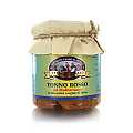 Filetti di tonno rosso sott'olio extravergine d'oliva selezionato, di alta qualità. Confezione di vetro da 300g. Ingredienti: TONNO rosso del Mediterraneo, olio extravergine di oliva, sale marino. Modo d'uso: ottimo come antipasto o alternativa a un secondo di pesce. Conservazione: riporre in frigo dopo l'apertura. Il TONNO rosso è da sempre la punta di diamante dell'Antica Tonnara di Favignana, premiato dalla rivista Gambero Rosso come miglior TONNO sott'olio d'Italia. Questo TONNO rosso è un prodotto derivato unicamente da pesce fresco pescato tra maggio e giugno. Il pescato, giunto nello stabilimento in giornata, viene tagliato e lasciato in acqua ghiacciata per favorire il dissanguamento e la chiusura delle fibre, per poi passare alle vasche di cottura forate in acciaio per la cottura al vapore e, successivamente, alle celle termicamente controllate e ventilate, che favoriscono la perfetta asciugatura del tonno. Il TONNO cotto passa alle mani sapienti degli operatori del confezionamento, che aggiungono olio extravergine d'oliva cultivar della valle del Belice, molito a freddo da olive Nocellara e Biancolilla, che si sposa benissimo con la qualità eccelsa di questo TONNO. L'Antica Tonnara di Favignana nasce dalla passione di Antonio Tammaro, che nel 1985 apre un piccolo negozio di gastronomia sull'Isola di Favignana. Oggi, la tradizione di famiglia continua con l'impegno di Michele, che cura la qualità e la ricercatezza dei prodotti. Punti chiave dell'attività sono l'accurata selezione del pescato e la lavorazione artigianale.
