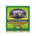 Trancio di pregiato tarantello di tonno rosso del Mediterraneo sott'olio, in confezione di latta a strappo da 300g. Ingredienti: tarantello, olio extravergine d'oliva d'oliva, sale marino. Consigli: come la ventresca, si consuma "come tolto dalla lattina o dal vasetto", per gustarne a pieno la sua unicità. Ottimo con patate lesse salate a piacere o con del cous cous a vapore realizzato con un delicato brodo di pesce e scorza di limone. Conservazione: riporre in frigo dopo l’apertura e consumare entro 1/3 giorni. Il tarantello di tonno rosso, uno dei tagli più pregiati del pesce, è il filetto sopra la ventresca. Ha una consistenza semi morbida e vanta pochi grassi. Risulta necessaria una certa esperienza per salvaguardare tale filetto e la ventresca; mani poco esperte rischierebbero di rovinare entrambi. Questo taglio "gourmet", dopo essere cotto a vapore e lasciato riposare su teli di lino per 24 ore in un'apposita cella di asciugatura, viene sezionato in filetti più piccoli che vengono collocati in stagionatura per ben 24 mesi dopo esser stati sterilizzati in autoclave. Da ogni TONNO pulito si ottiene solo una quantità di tarantello pari al 4%. Il nome del taglio richiama i suoi scopritori: i pescatori tarantini erano soliti prendersi cura di questo taglio per poi rivenderlo come prodotto pregiato rispetto ai più comuni filetti di TONNO. L'Antica Tonnara di Favignana nasce dalla passione di Antonio Tammaro, che nel 1985 apre un piccolo negozio di gastronomia sull'Isola di Favignana. Oggi, la tradizione di famiglia continua con l'impegno di Michele, che cura la qualità e la ricercatezza dei prodotti. Punti chiave dell'attività sono l'accurata selezione del pescato e la lavorazione artigianale.