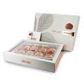 Scatola regalo con 8 marron glacé, linea "Selezione Agrimontana" (175g). I marroni Agrimontana sono raccolti a mano e attentamente selezionati uno a uno per essere sapientemente glassati da abili pasticcieri. I marron glacé della linea "Selezione Agrimontana" vantano una pezzatura di 50-60 frutti per kg (calibro medio). Origine: prevalentemente dal centro Italia (Appennino Tosco-Emiliano, province di Firenze e Bologna). I marroni Agrimontana sono lavorati dal fresco, senza l'impiego di anidride solforosa. I mastri pasticcieri Agrimontana chiamano questo processo "curatura", nome che ben definisce la perizia e l'affetto con cui le varie operazioni vengono svolte. Dopo la "novena" (la fase in cui il prodotto è posto in acqua, a riciclo giornaliero con la loro buccia, al fine di maturare le migliori note aromatiche), viene realizzata la sbucciatura a vapore, terminata a mano per assicurarsi che i marroni rimangano perfettamente integri. Step finale è la canditura a caldo, senza forzature, nel pieno rispetto delle caratteristiche organolettiche del prezioso frutto della castagna, che viene impreziosito da un velo di zucchero di canna e vaniglia Bourbon in bacche. Agrimontana è un'azienda che, ricorrendo alle proprie abilità artigianali supportate dalla tecnologia, riesce a offrire prodotti di altissima gamma, ottenuti con lavorazioni pulite, senza coloranti né conservanti. La storia di Agrimontana è cominciata nel 1972 con la canditura, un tradizionale metodo di conservazione con lo zucchero, cui sono seguiti gustose confetture e altri prodotti alimentari pregiati che comprendono creazioni sia tradizionali sia innovative, sempre all'insegna della naturalità e dell'alta qualità.
