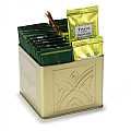 Scatola metallica color oro da tavolo, contenente 32 bustine di tisane in pratiche ed eleganti bustine Cristal incartate singolarmente. La selezione include 4 tipi diversi d'infusi alle erbe: (A) Verbena: tisana alla verbena // (B) Tisane Bali: tisana aromatizzata, con fiore di tiglio, verbena, aromi (litchi, pompelmo, pesca di arbusti e rosa), petali di fiori // (C) Tisane du Berger: tisana con verbena, fiori di tiglio, foglie di menta piperita, fiori d'arancio, citronella // (D) Tisane des Merveilles: tisana aromatizzata, con verbena, fiori di tiglio, petali di fiori, aromi (rabarbaro, lampone, fragola gariguette, dattero, fiori d'arancio) e olio essenziale di rosa. Peso netto totale del tè: 56 g. La gloriosa storia di Dammann Frères comincia nel 1692 con l'autorizzazione di Luigi XIV a importare tè in Francia. Dopo più di tre secoli, Dammann Frères continua a essere riconosciuta come una istituzione, commercializzando più di 300 varianti di tè pregiato in vari formati, tra cui pacchetti di tè sfuso, elegantissime confezioni di latta o raffinate bustine Cristal.