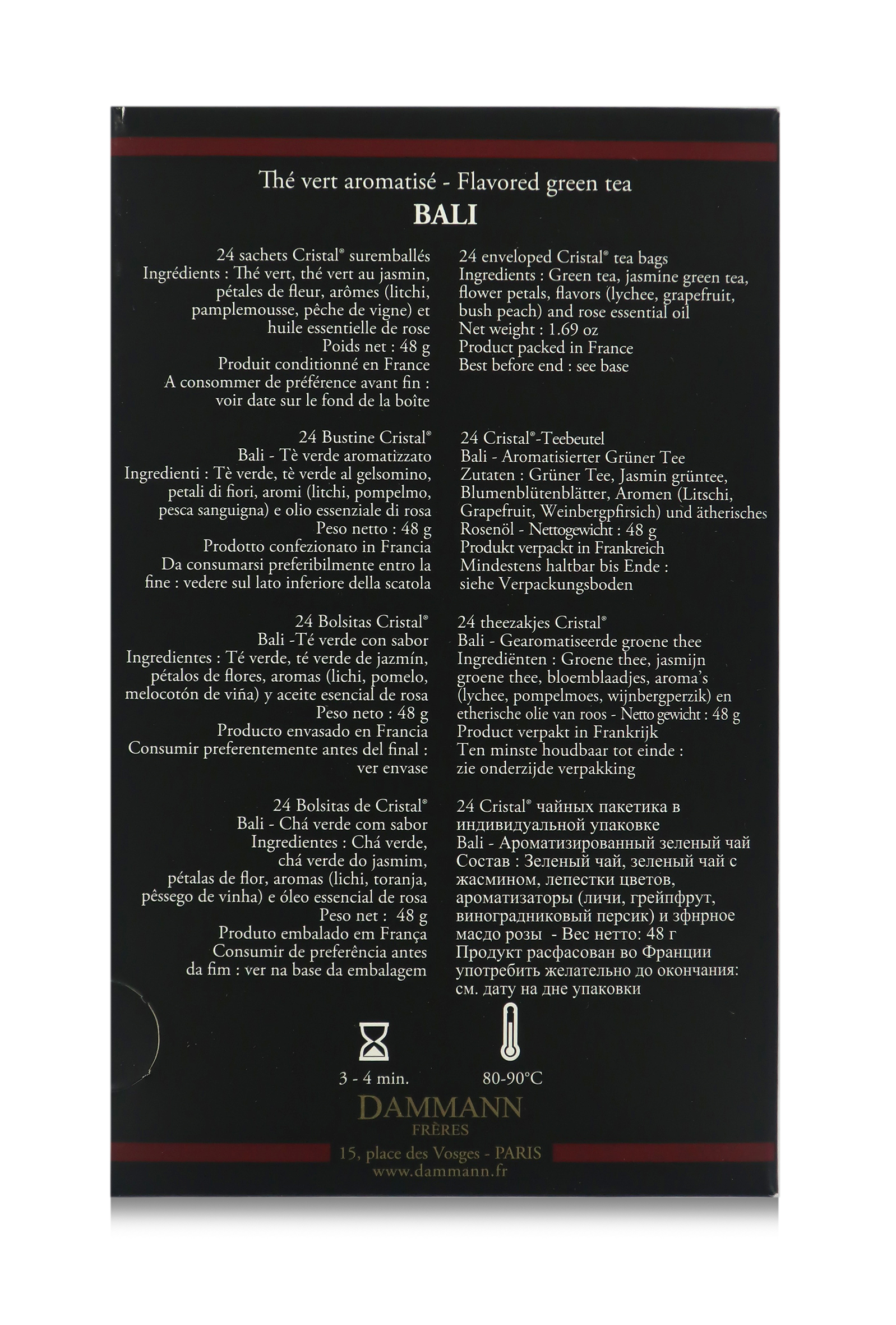 Questo tè verde Bali vanta un delicato equilibrio di note fresche, fruttate e floreali. È delicatamente profumato e risulta gradevole tanto freddo quanto caldo. Tra le note più accese, si distinguono gelsomino, litchi, pompelmo, pesca della vigna e rosa. Il tè verde Bali di Dammann Frères è contenuto in esclusive e pratiche bustine "Cristal" incartate singolarmente. La gloriosa storia di Dammann Frères comincia nel 1692 con l'autorizzazione di Luigi XIV a importare tè in Francia. Dopo più di tre secoli, Dammann Frères continua a essere riconosciuta come una istituzione, commercializzando più di 300 varianti di tè pregiato in vari formati, tra cui pacchetti di tè sfuso, elegantissime confezioni di latta o raffinate bustine Cristal. Conservare in luogo fresco e asciutto, al riparo dalla luce e lontano da fonti di calore.