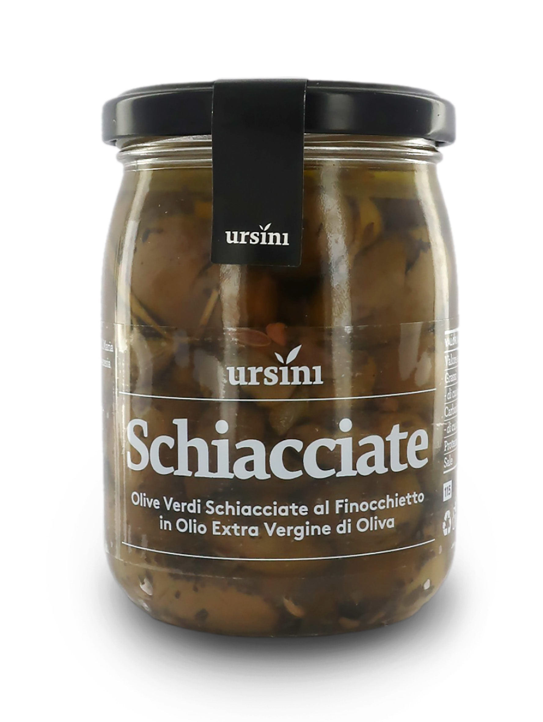 Olive schiacciate aromatizzate al finocchietto, in olio extravergine di oliva, ideali per antipasti, insalate di pasta e riso. Ottime anche sulla pizza. Il gusto pieno dell'olio extravergine d'oliva e quello particolare di queste olive verdi italiane vengono ben bilanciati dall'aromatica freschezza del finocchietto. Ingredienti: olive schiacciate in salamoia [olive, acqua, aceto di vino (contiene solfiti), sale, acidificante: acido citrico] 70%, olio extravergine di oliva 28%, capperi, prezzemolo, aglio, semi di finocchio 0,2%, sale, rosmarino. Allergeni: solfiti. Può contenere lupini. Prodotto in uno stabilimento che utilizza sedano, frutta secca in guscio, pesce, pane, senape, prodotti a base di latte e derivati delle uova. Modalità di conservazione: il prodotto chiuso si conserva a temperatura ambiente. Dopo l'apertura conservare in frigorifero e consumare entro un paio di giorni. La Famiglia Ursini vanta una lunga tradizione nel mondo dell'olio. Già nel 1800 i suoi componenti erano considerati esperti della cura degli oliveti. Ai giorni nostri, a Fossacesia, la magnifica Costa dei Trabocchi in Abruzzo ospita oliveti controllati, un frantoio di famiglia e una cucina-laboratorio, in cui sapienza ed esperienza si uniscono alla creatività e all'innovazione per concepire oli e prodotti alimentari di grande qualità.