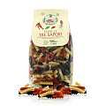 Fusilli tre sapori. Fanno parte della linea "La Pasta Multicolore", che include vari formati di pasta variopinta. La colorazione è del tutto naturale, ottenuta con pigmenti di origine vegetale (es. barbabietola o curcuma) o animale (es. nero di seppia per la pasta nera). In questi fusilli, la colorazione è data dalla varietà della semola, dal peperoncino, dal nero di seppia e dalla bietola. 6 confezioni da 500 grammi. Ingredienti: Semola di grano duro, Acqua, Peperoncino rosso in polvere, Nero di seppia, Bietola rossa in polvere. Allergeni: Contiene cereali contenenti glutine e prodotti derivati dei molluschi. Fabbricato in stabilimento che lavora anche prodotti a base di uova e pesce. Condizioni di conservazione: tenere in luogo asciutto e lontano dai cereali. La pasta Morelli è preparata artigianalmente in un pastificio a gestione familiare in provincia di Pisa, fondato nel 1860. Ormai da ben 5 generazioni, la pasta viene preparata usando ottime semole di grano duro e tecniche classiche, che includono trafilatura al bronzo ed essiccatura a basse temperature, nel pieno rispetto della tradizione. Fiore all'occhiello della produzione Morelli è la pasta al germe di grano, che impiega un ingrediente naturale solitamente scartato, che la lavorazione artigianale, invece, consente di reintrodurre nell'impasto, donando alla pasta un gusto e un aroma molto particolari. La gamma di paste Morelli include: pasta al germe di grano, le tipicità regionali, la pasta all'uovo e germe di grano, la pasta integrale di filiera Toscana e integrale Senatore Cappelli, pasta di legumi, pasta senza glutine, grani antichi, farro e kamut, pasta aromatizzata monogusto, multicolore e articoli da regalo.