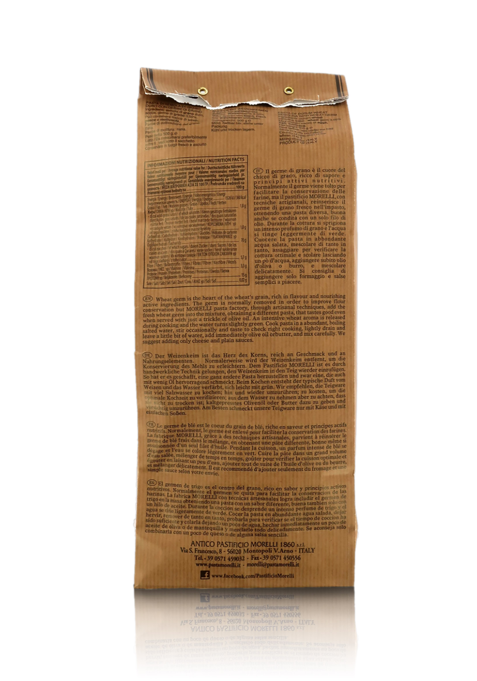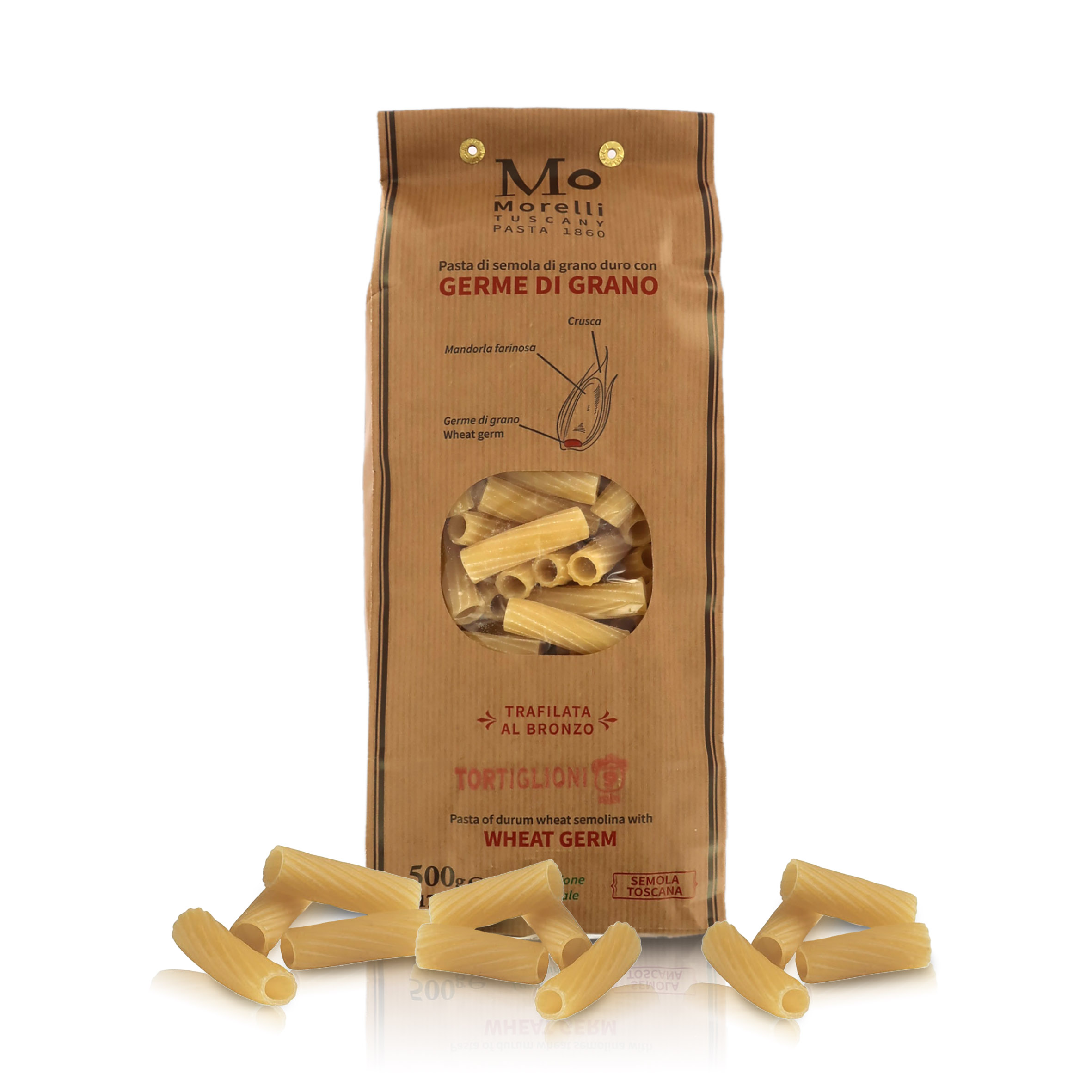 Tortiglioni, pasta al germe di grano, 6 confezioni da 500 grammi. Ingredienti: semola di grano duro, acqua, germe di grano (3,5%). Allergeni: Contiene cereali contenenti glutine. Fabbricato in stabilimento che lavora anche prodotti a base di uova, di pesce, prodotti derivati dei molluschi. Condizioni di conservazione: tenere in luogo asciutto e lontano dai cereali. La pasta Morelli è preparata artigianalmente in un pastificio a gestione familiare in provincia di Pisa, fondato nel 1860. Ormai da ben 5 generazioni, la pasta viene preparata usando ottime semole di grano duro e tecniche classiche, che includono trafilatura al bronzo ed essiccatura a basse temperature, nel pieno rispetto della tradizione. Fiore all'occhiello della produzione Morelli è la pasta al germe di grano, che impiega un ingrediente naturale solitamente scartato, che la lavorazione artigianale, invece, consente di reintrodurre nell'impasto, donando alla pasta un gusto e un aroma molto particolari. La gamma di paste Morelli include: pasta al germe di grano, le tipicità regionali, la pasta all'uovo e germe di grano, la pasta integrale di filiera Toscana e integrale Senatore Cappelli, pasta di legumi, pasta senza glutine, grani antichi, farro e kamut, pasta aromatizzata monogusto, multicolore e articoli da regalo.